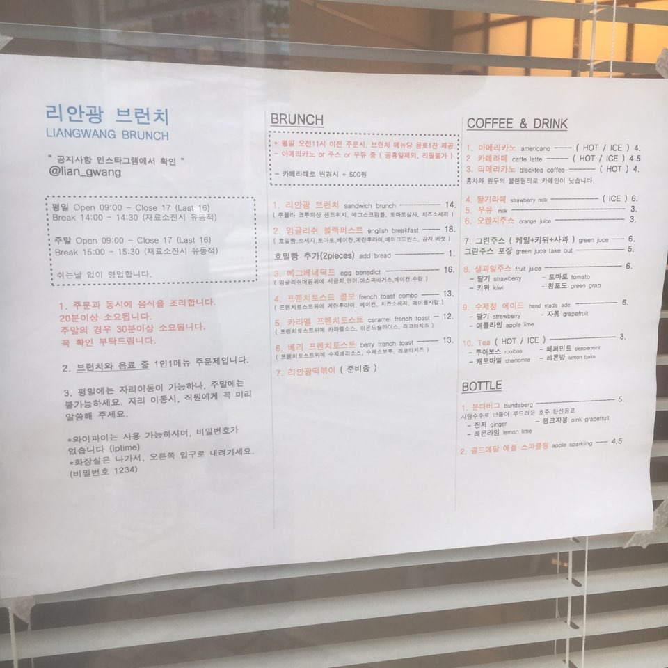 리안광 메뉴입니다. 베스트메뉴는 리안광 브런치와 잉글리쉬 블랙퍼스트라고 해요. 브런치와 음료 중 1인 1 메뉴 주문제라고하니 참고해주시기 바랍니다. 주문과 동시에 음식을 조리하기 때문에 20분 이상 소요된다고 해요.