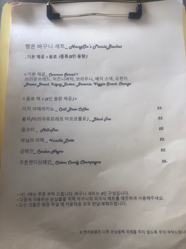 역시 메인은 행온 바구니세트 입니다. 피크닉 세트는(기본 제공+음료 1종류)가 포함되어있는데요. 기본 제공은 브라운 브레드, 이즈니 버터, 브라우니, 베지스낵, 오렌지와 음료 택 1 한 가지를 고르시면 됩니다.