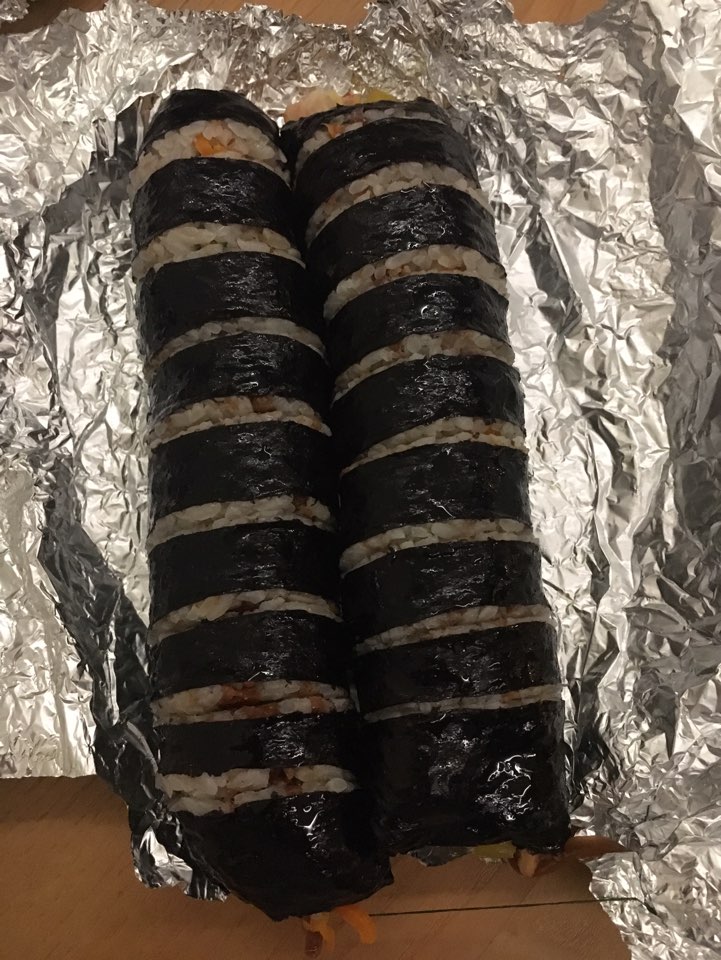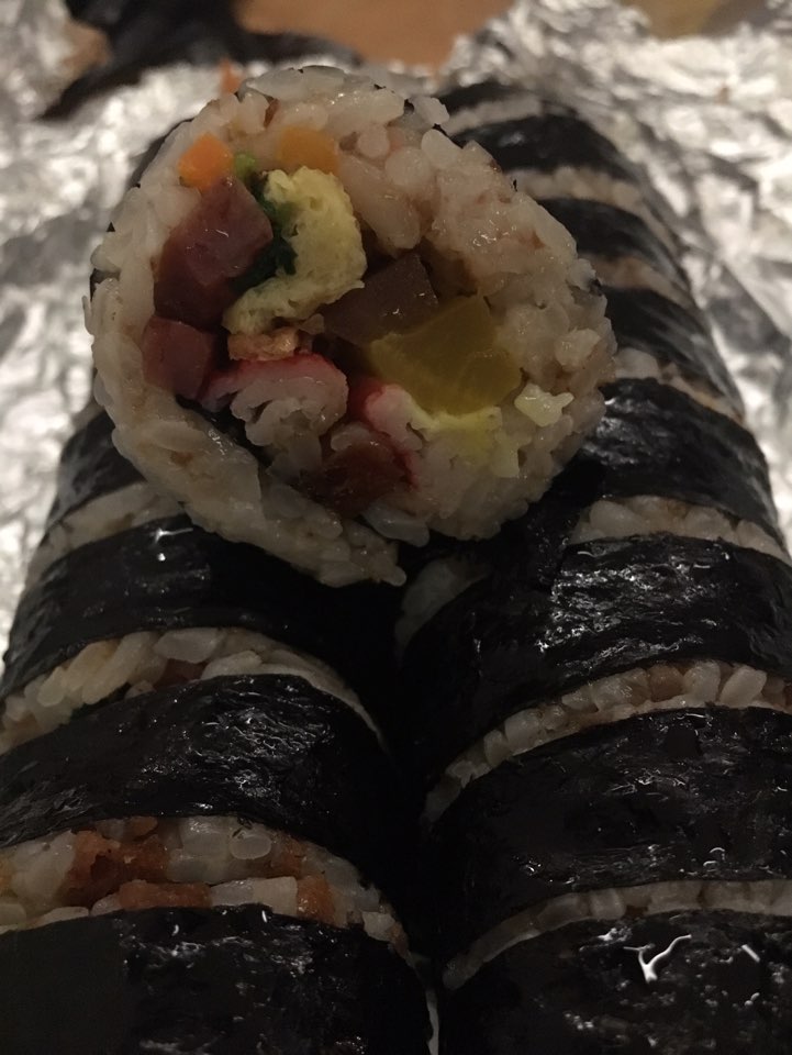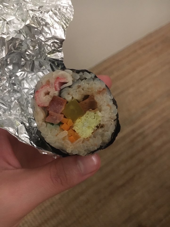 그리고 또한 가지 독특했던 점이 김밥을 씹을 때마다 튀김? 같은 바삭한 식감이 느껴 저 숙소에 도착하자마자 김밥을 자세히 들여다(?) 보았는데요. 밥에 유부 튀김(?) 이 박혀있더라고요. 밥을 양념하실 때 넣어서 양념을 하셨나 봅니다.