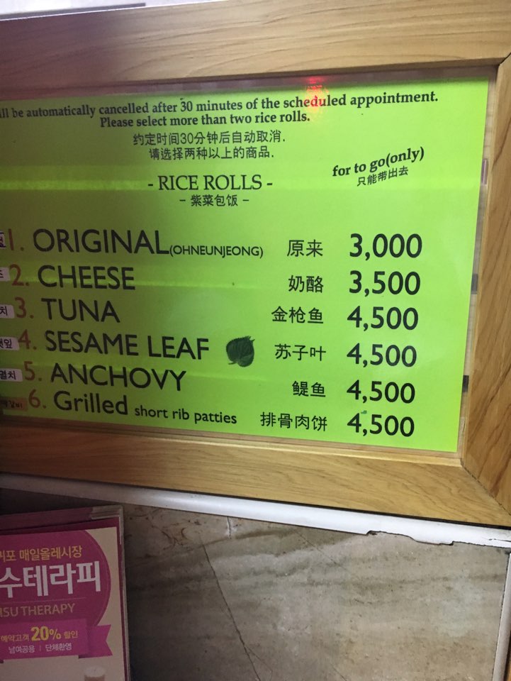 오는 정 김밥 메뉴입니다. 오는정김밥(오리지널) 3,000원 / 치즈김밥 3,500원 / 참치김밥 4,500원 / 깻잎김밥 4,500원 / 멸치김밥 4,500원 / 떡갈비김밥 4,500원 이라고해요. 가장 많이 팔리는 인기 best메뉴는 오는정김밥(오리지널)이라고 합니다.