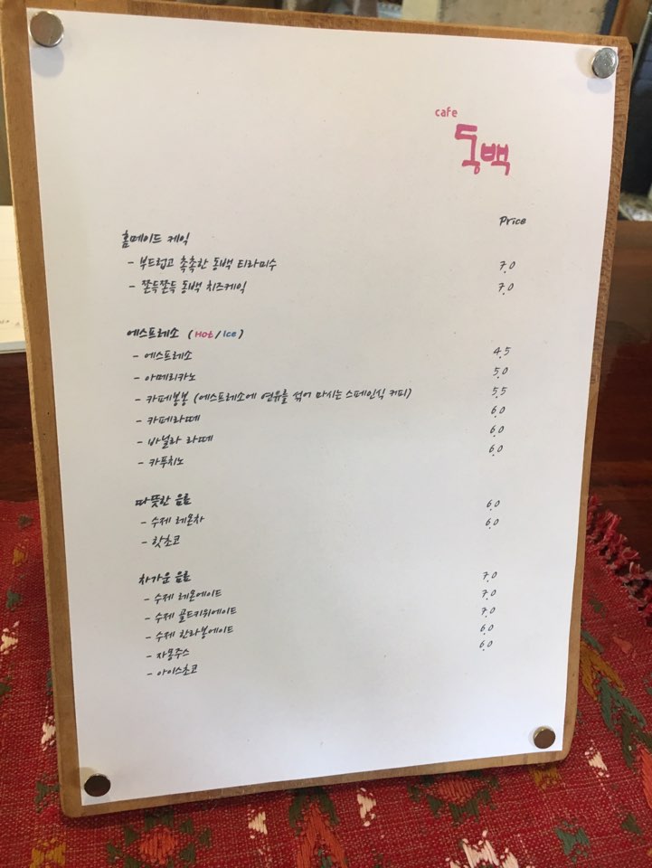 카페 동백의 메뉴판. 홈메이드 케이크와 커피, 따뜻한 레몬차와 핫초코, 차가운 레몬에이드, 골드키위, 한라봉에이드와 자몽주스 그리고 아이스초코가 준비되어있습니다.