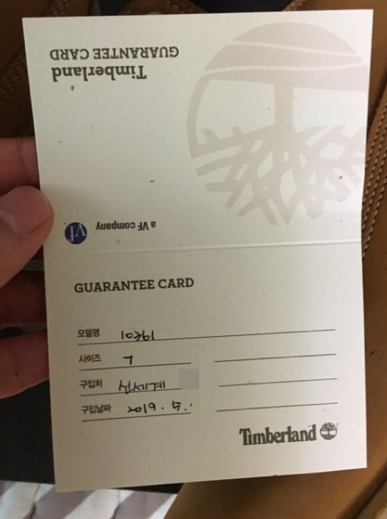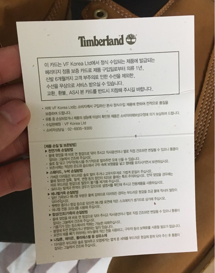 팀버랜드 개런티 카드는 위와 같이 생겼습니다. 정품 보증카드로 제품 구입일로부터 의류 1년, 신발 6개월까지 고객 부주의로 인한 수선 제외 수선 무상 서비스를 받을 수 있다고 해요. 교환, 환불, AS시 반드시 이 카드를 지참해주셔야 한다고 합니다.