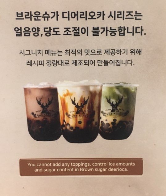 그리고 위에서 T/S/I에 대해서 이야기해드렸는데 브라운 슈가 디어리 오카 시리즈는 얼음 양, 당도 조절이 불가능하다고 해요. 이 메뉴들은 최적의 맛을 제공하기 위해 정량대로 제조되어 만들어진다고 합니다.