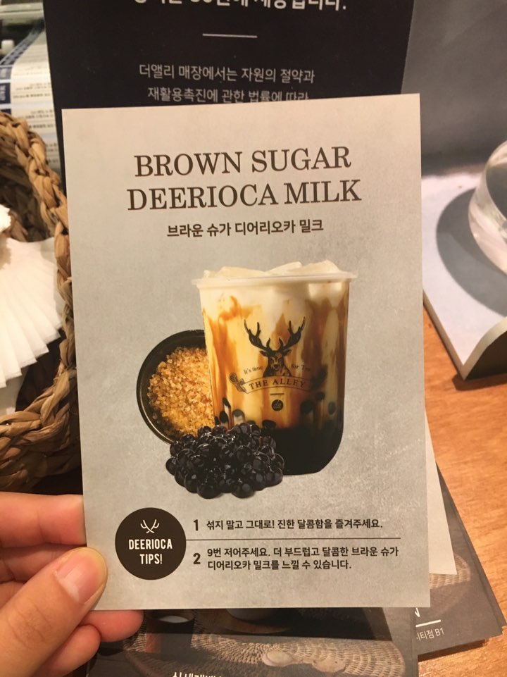 제일 인기 메뉴인 브라운 슈가 디어리 오카 밀크 메뉴 팁이라고 해요. 처음에 음료를 받으면 섞지 말고 그대로 진한 달콤함을 즐긴 후 9번 저어서 더 부드럽고 달콤한 브라운 슈가 디어리 오카 밀크를 느낄 수 있다고 해요.