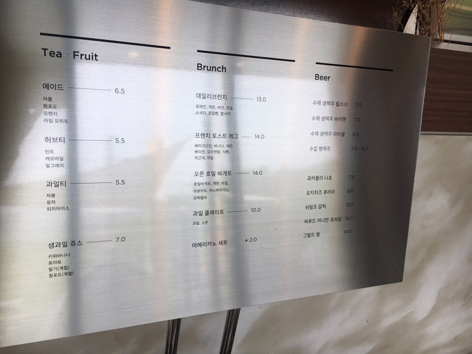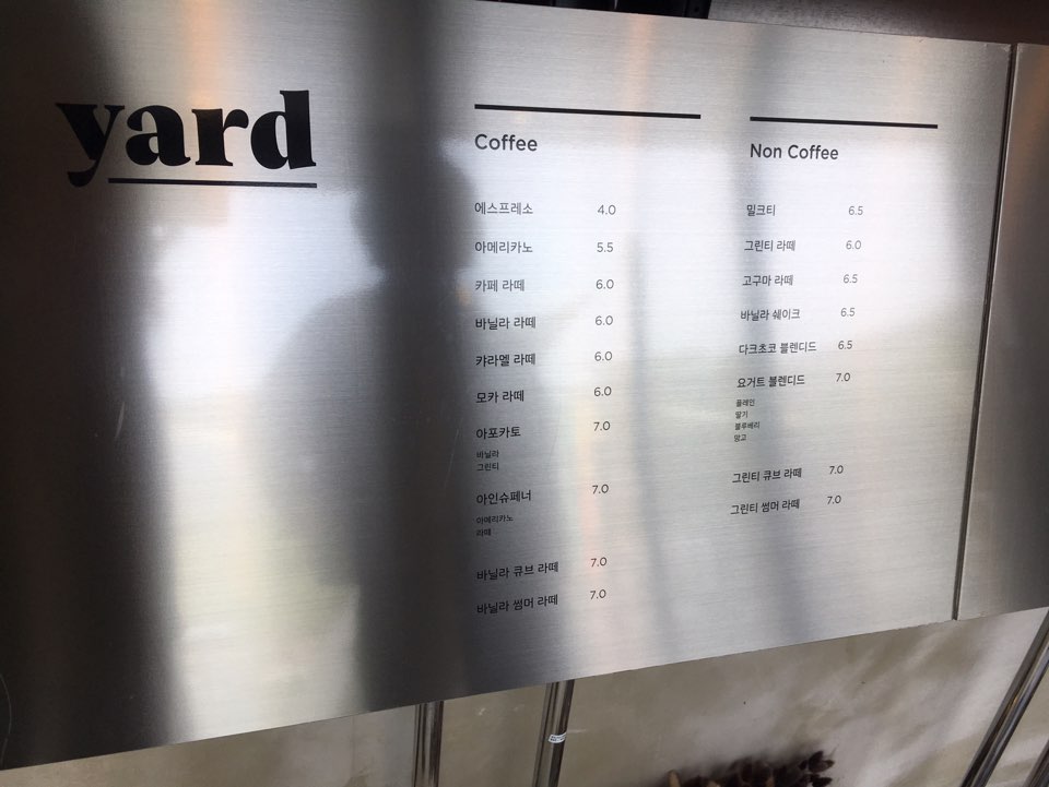 카페 야드의 메뉴입니다. 커피/논 커피 메뉴로 나뉘어있고 티, 생과일, 브런치, 맥주까지 준비되어있더라고요.