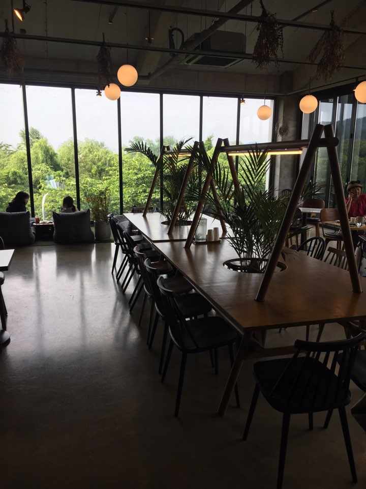 SNS에서 주로 보이는 #야드 하면 보이는 이곳 바로 빈백 존인데요. 통유리로 창밖 너머를 보며 반 누워서 커피를 마실 수 있다는 점이 정말 좋았습니다. 하지만 창밖 너머는 큰 나무들의 잎사귀밖에 보이지 않는다는 단점이...... 벚나무라 벚꽃이 피었을 때는 정말 이쁠 것 같더라고요.