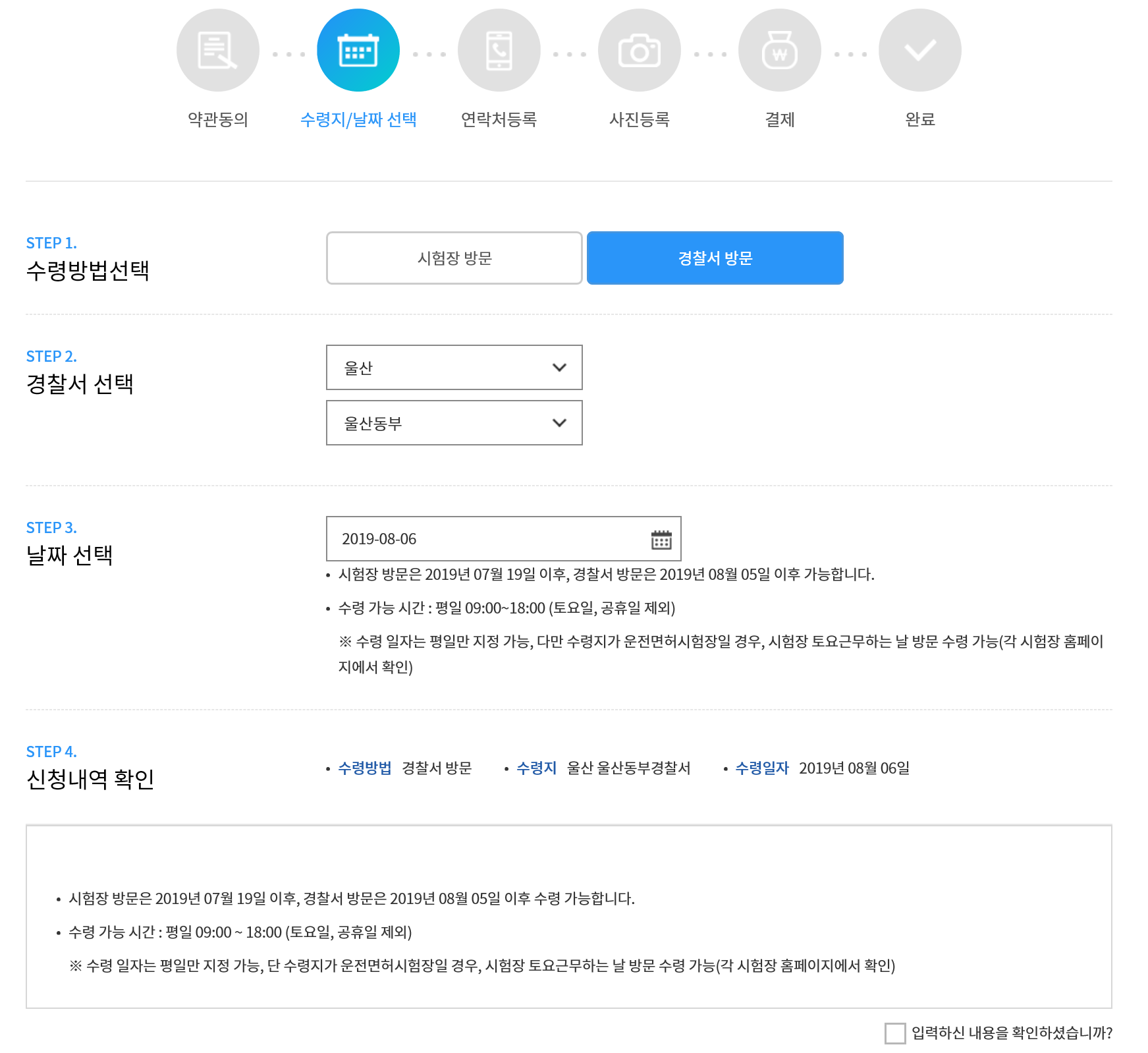약관 동의가 끝나면 수령방법을 선택하는 항목이 보이실 텐데요. 집 근처에 경찰서가 가깝다면 경찰서 방문을 선택해주시고, 시험장이 더 가깝다면 시험장 방문을 선택해주시면 됩니다. 경찰서 방문을 선택하시면 근처 어느 지역 경찰서에서 찾으실 건지 선택해주시고, 날짜를 선택해주시고 마지막으로 신청내역을 확인해주시면 됩니다.