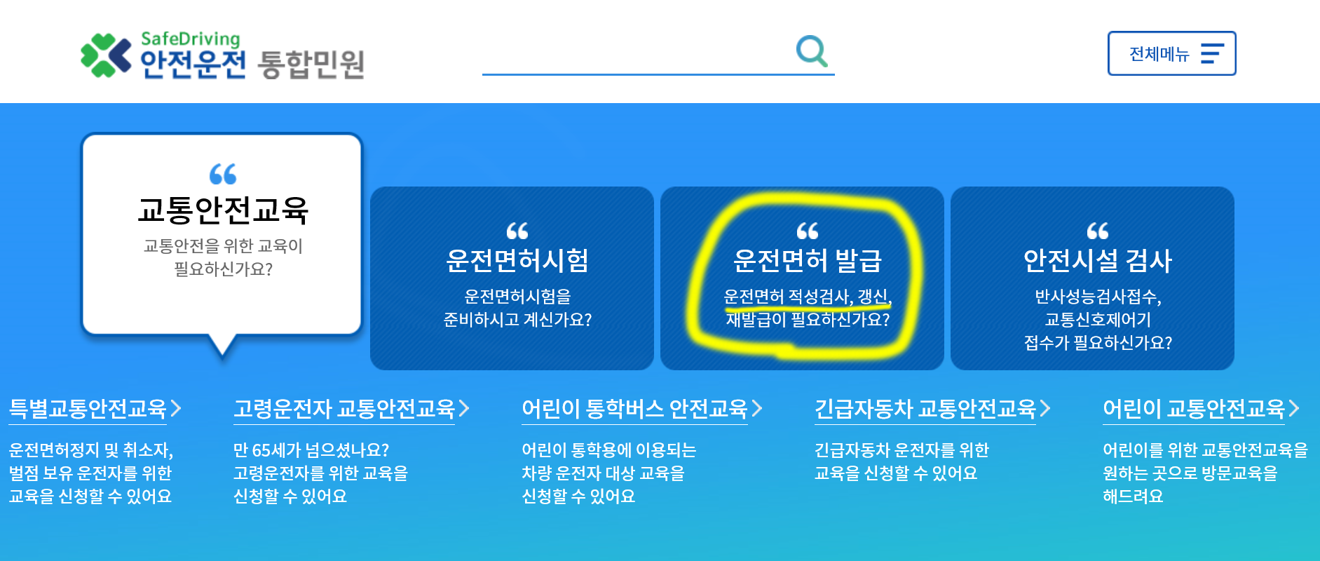 링크를 클릭하여 들어가면 위 사진처럼 교통안전교육, 운전면허시험, 운전면허 발급, 안전시설 검사 네 가지 항목으로 나뉘어있는데요. 운전면허 발급 (운전면허 적성검사, 갱신, 재발급)을 클릭하여줍니다.