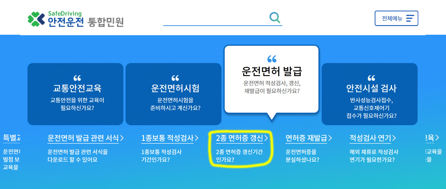 '운전면허 발급' 항목을 클릭하시면 바로 아래에 운전면허 발급 관련 서식, 1종 보통 적성검사, 2종 면 서증 갱신, 면허증 재발급, 적성검사 연기 부가 항목들이 보이는데요. '2종 면허증 갱신' 항목을 클릭하여줍니다.