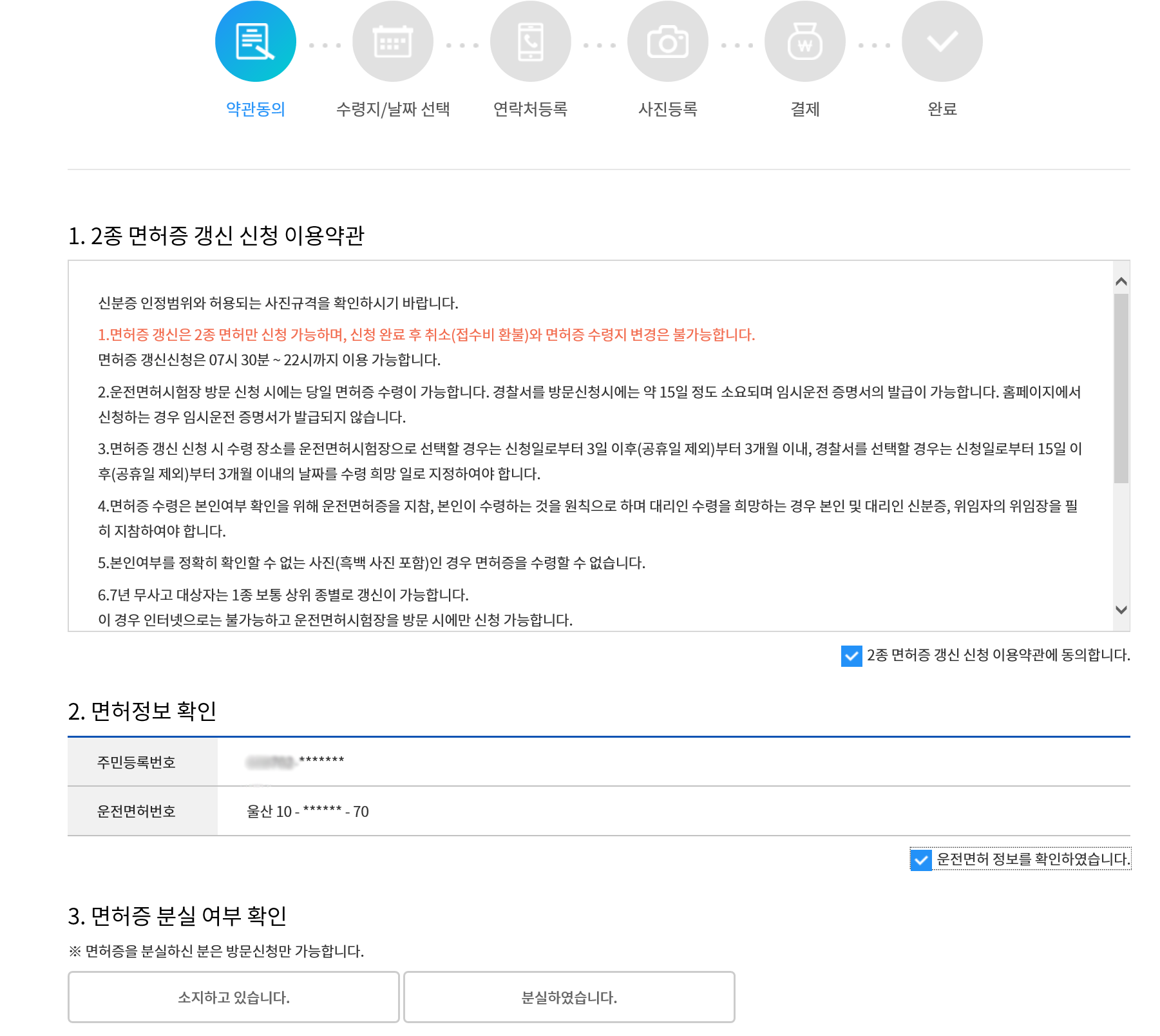 본인 확인이 끝나면 2종 면허증 갱신 신청 이용약관과 면허정보 확인, 면허증 분실 여부 확인을 진행하게 되는데요. 면허증이 분실한 상태라면 방문신청만 가능하기 때문에 이 부분 꼭 참고해주셔서 진행해주시기 바랍니다.