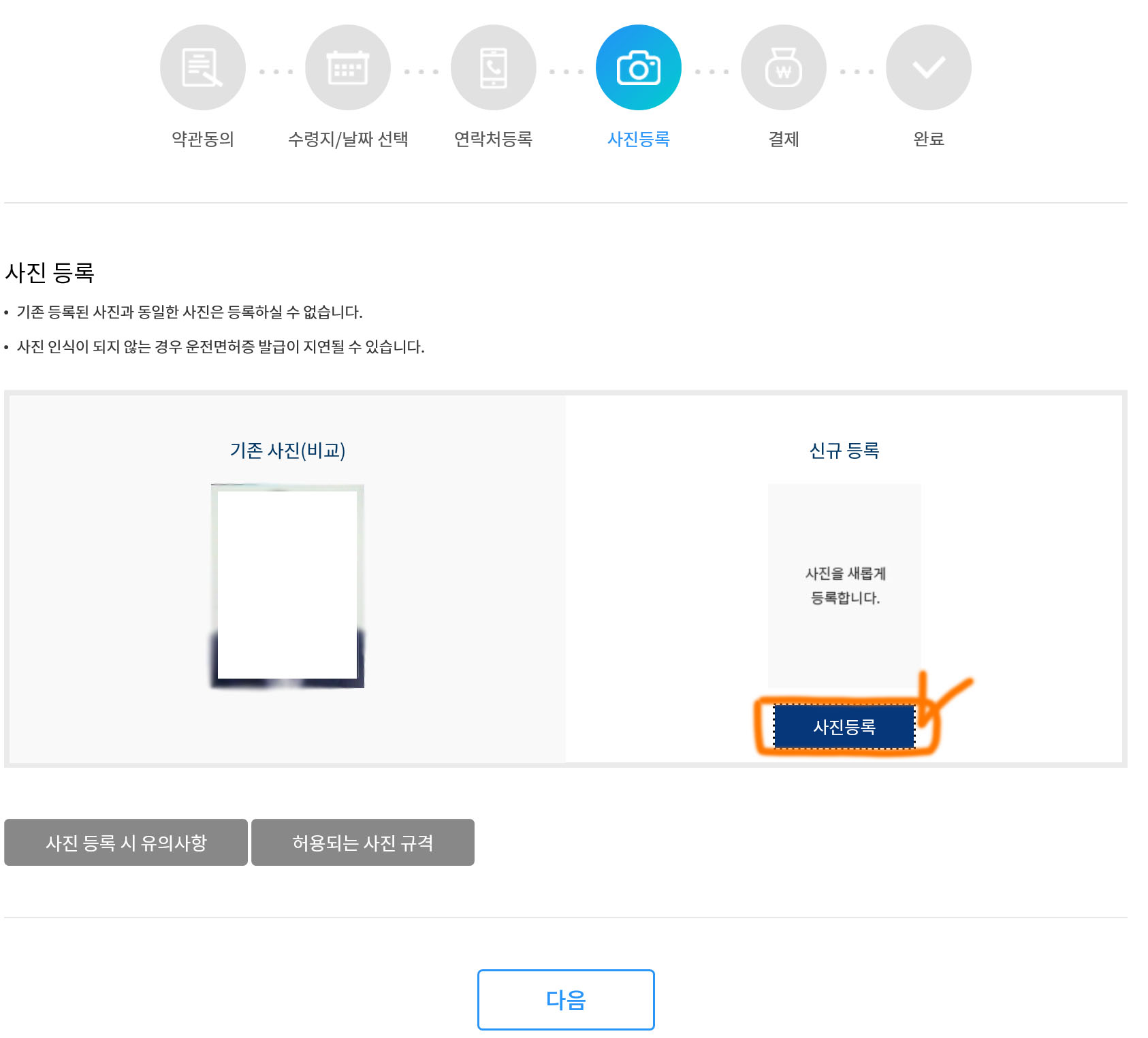 연락처 등록이 끝나면 사진 등록 항목으로 넘어오게 되는데요. 사진은 기존 등록된 사진과 동일한 사진은 등록할 수가 없기 때문에 반드시 6개월 내 촬영한 새 사진으로 등록을 진행하셔야 합니다. 집에 스캐너가 있으시다면 스캐너를 이용하여 등록을 진행해주시면 되고, 스캐너가 없으시다면 휴대폰으로 사진이 잘 보이도록 촬영하셔서 사진 등록을 진행해주시면 됩니다.