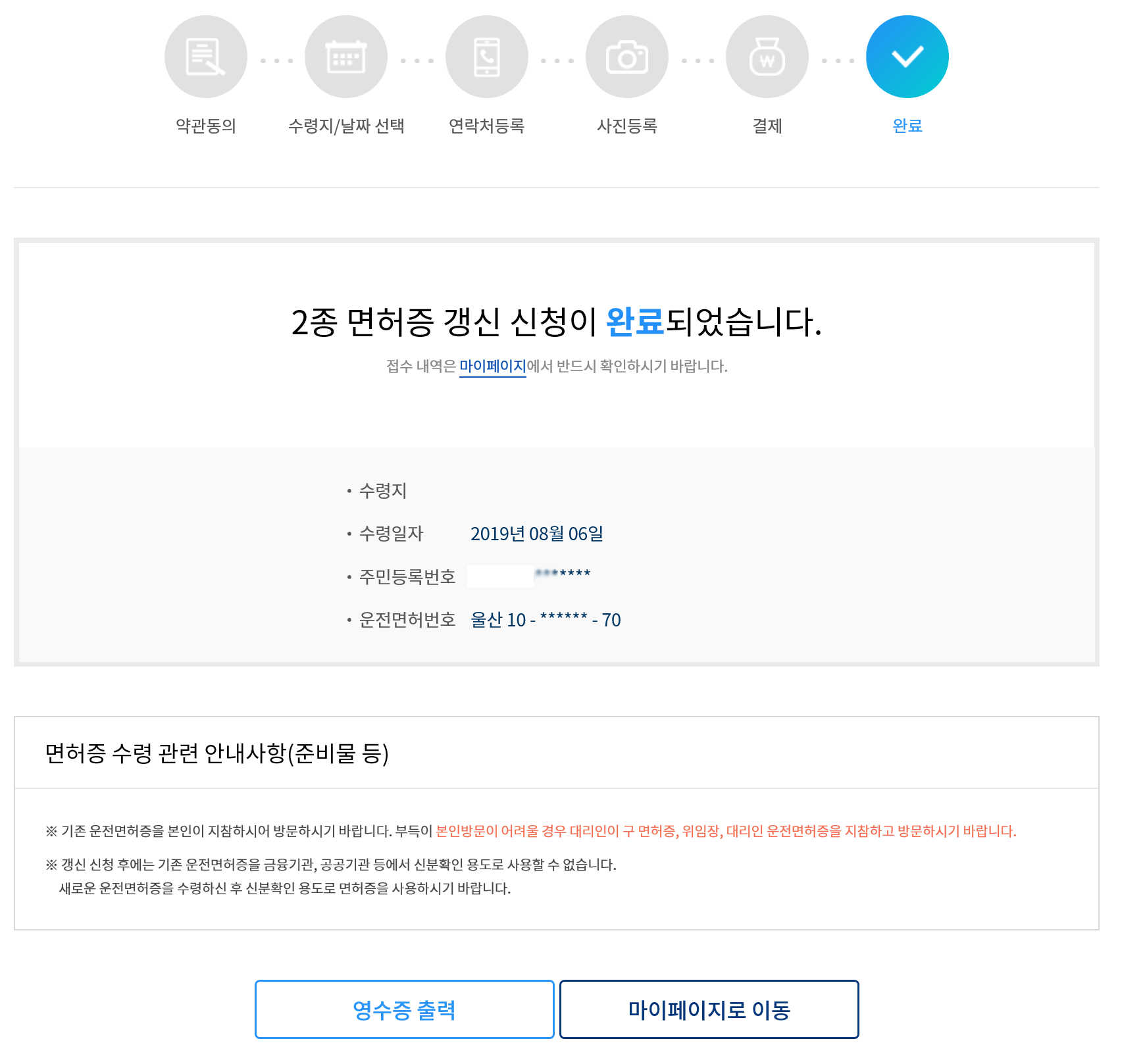 결제가 끝나면 인터넷으로 간단하게 2종 면허증 갱신 신청이 완료됩니다. 마지막으로 한번 더 수령지와 수령일자를 확인해주시고 창을 닫아주시면 됩니다.