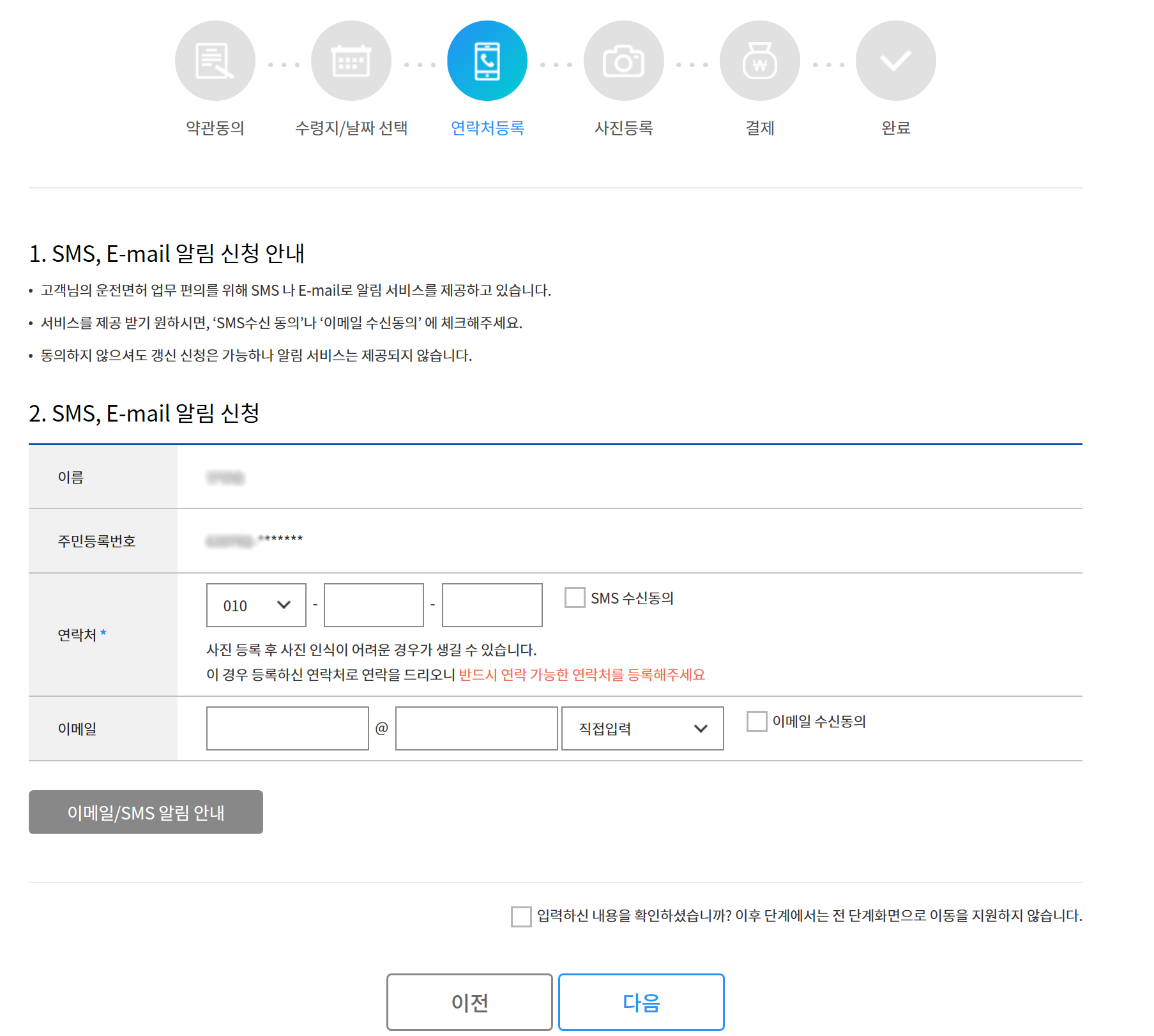 이제 마지막으로 운전면허증 발급에 대한 알림 서비스를 제공받기 위해 연락처와 이메일을 입력해주시면 됩니다. 이메일이 없으시다면 입력하지 않으셔도 되지만, 연락처는 반드시 입력하셔야 한다고 해요.