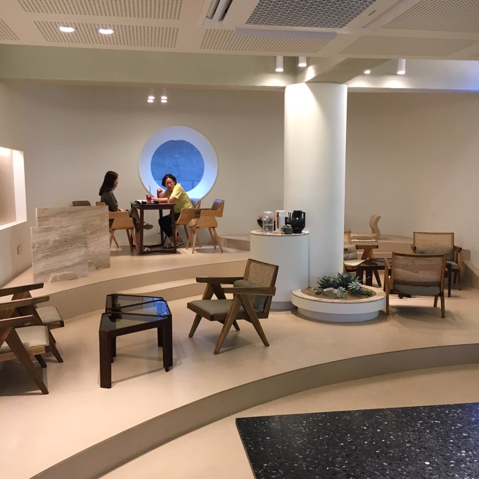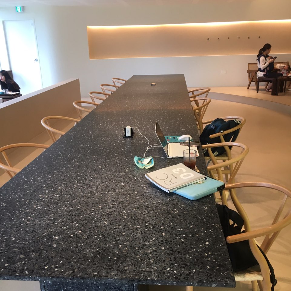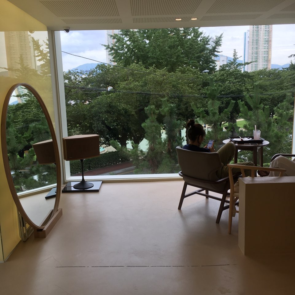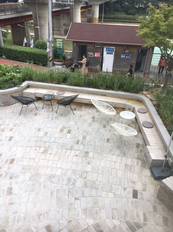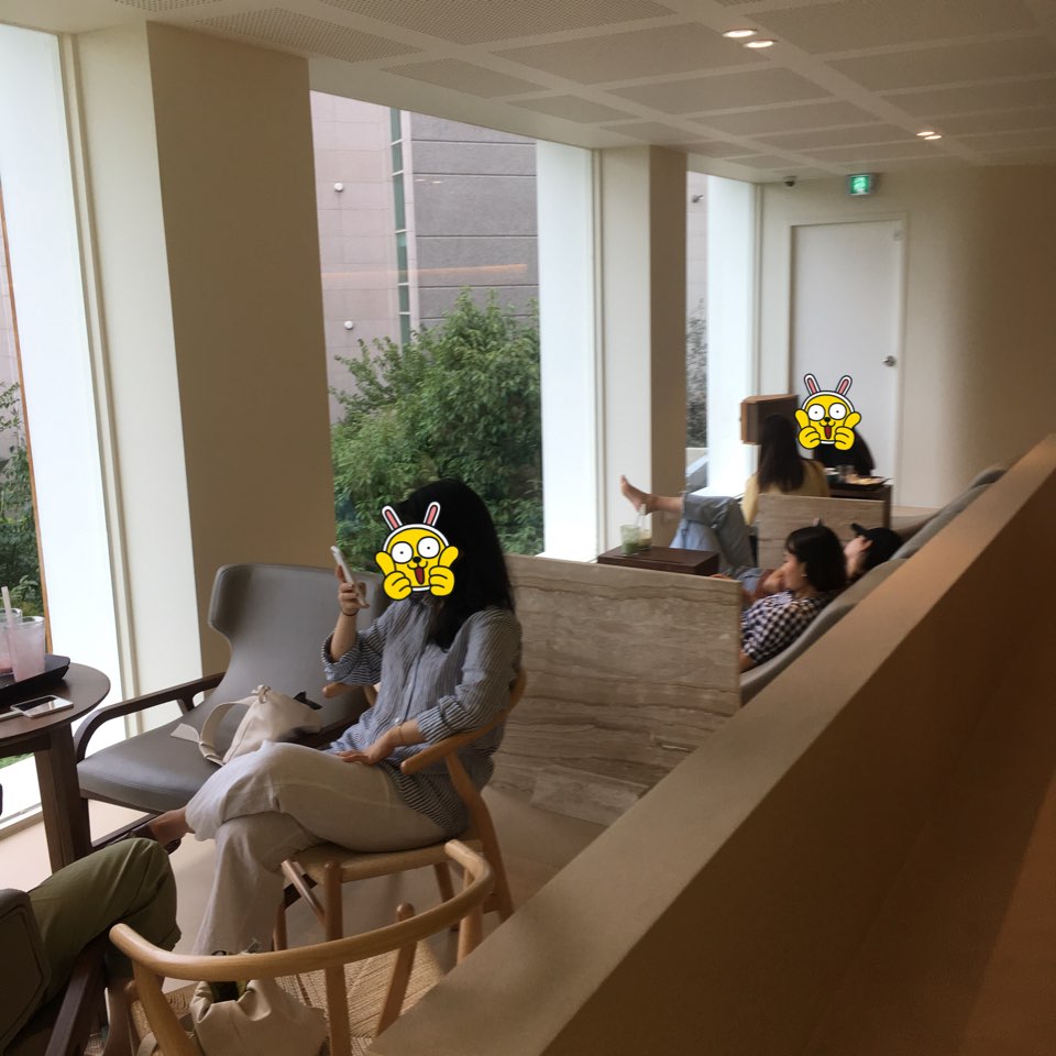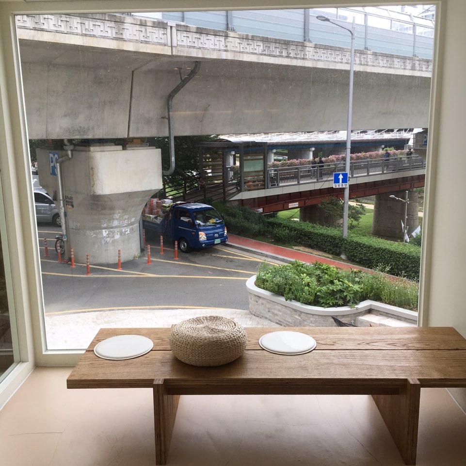 그리고 가장 마음에 들었던 이 공간. 통유리 너머로 사람들을 구경할 수 있지만 커다란 육교 때문에 시야가 막혀서 답답하더라고요. 육교만 없었으면 정말 좋았을 공간. 오래 앉아있으면 엉덩이가 아프답니다..ㅋㅋㅋㅋ