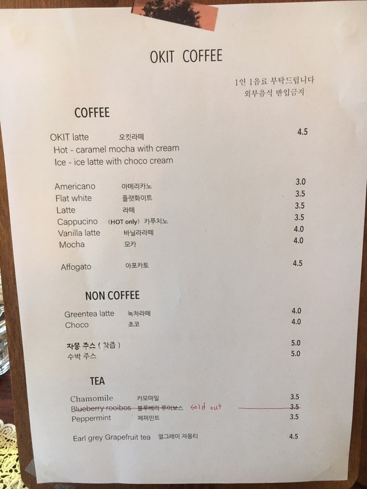 주문한 음료를 직접 가져다주시는 것 한 가지만 가장 마음에 들었던 것 같네요..ㅋㅋ;; 오킷라떼는 라뗴 위에 초코크림이 올라가는데 이 크림 '만' 맛있었습니다. 바닐라라테는 바닐라 시럽이 들어간 건지 안 들어간 건지 커피도 반샷만 들어간 것처럼 밍밍하고 별로였어요.