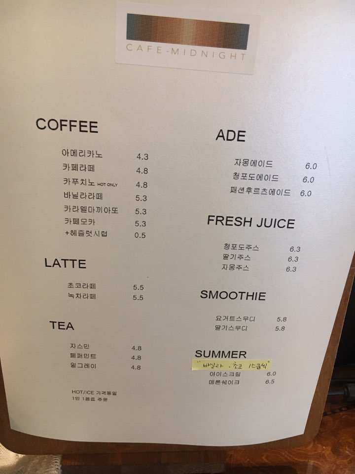카페 미드나잇 메뉴입니다. 커피메뉴와 에이드, 생과일쥬스, 라떼, 티, 스무디. 여름한정메뉴인 아이스크림, 메론쉐이크가 있습니다.