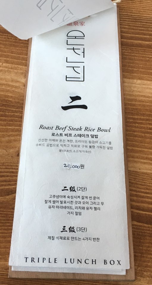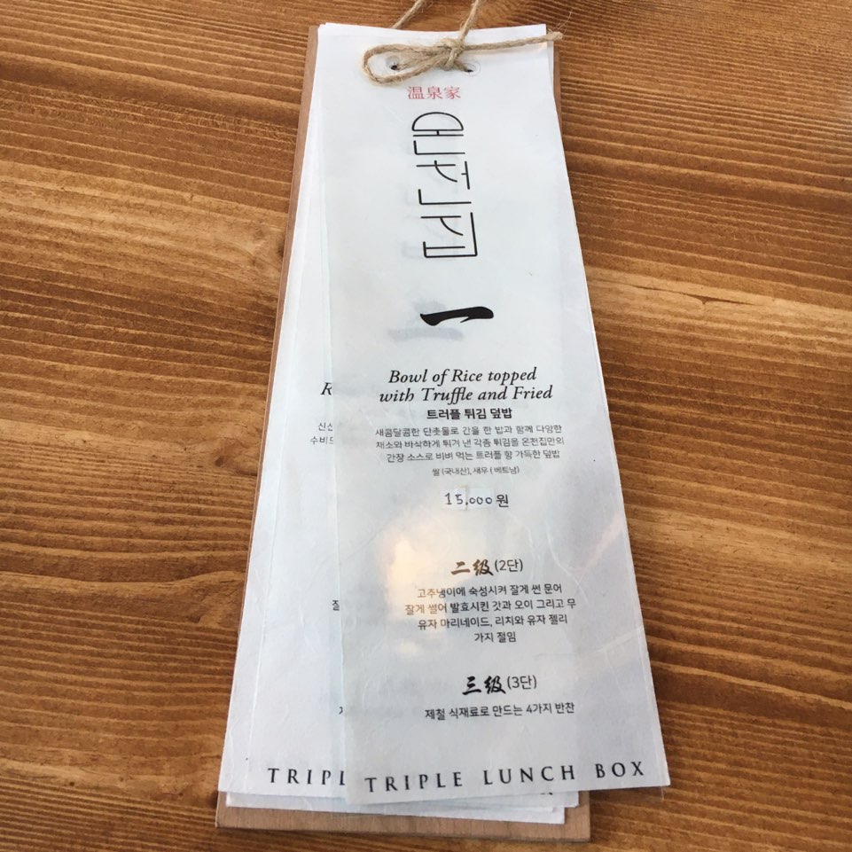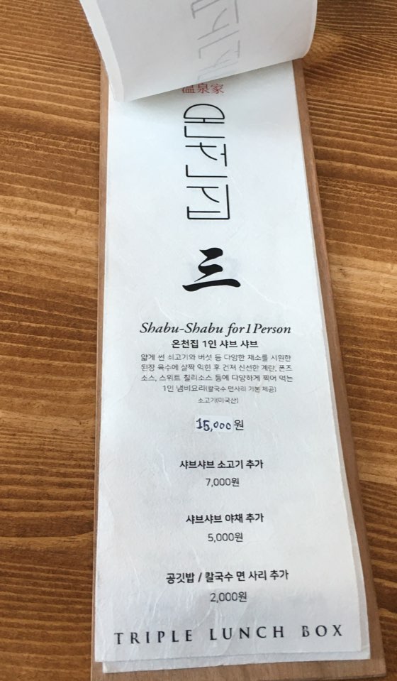 온천 집 메뉴입니다. 메뉴판종이가 한지로 되어있고 메뉴판과 가게분위기랑 잘어울리더라고요. 메뉴는 트리플 튀김덮밥, 로스트 비프 스테이크 덮밥, 온천집 1인 샤브샤브가 준비되어있습니다.