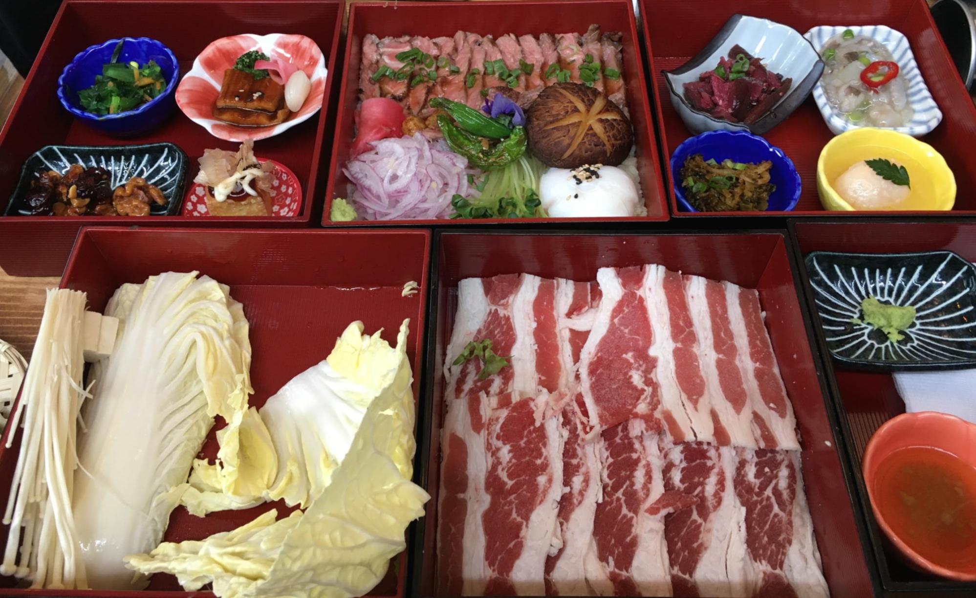 건너편의 3단은 스테이크 덮밥이고 앞쪽에 있는 것은 1인 샤브샤브입니다. 기본 반찬들이 정갈하게 나오는데 하나하나 정성이 담긴 것이 맛에서 느껴지더라고요.