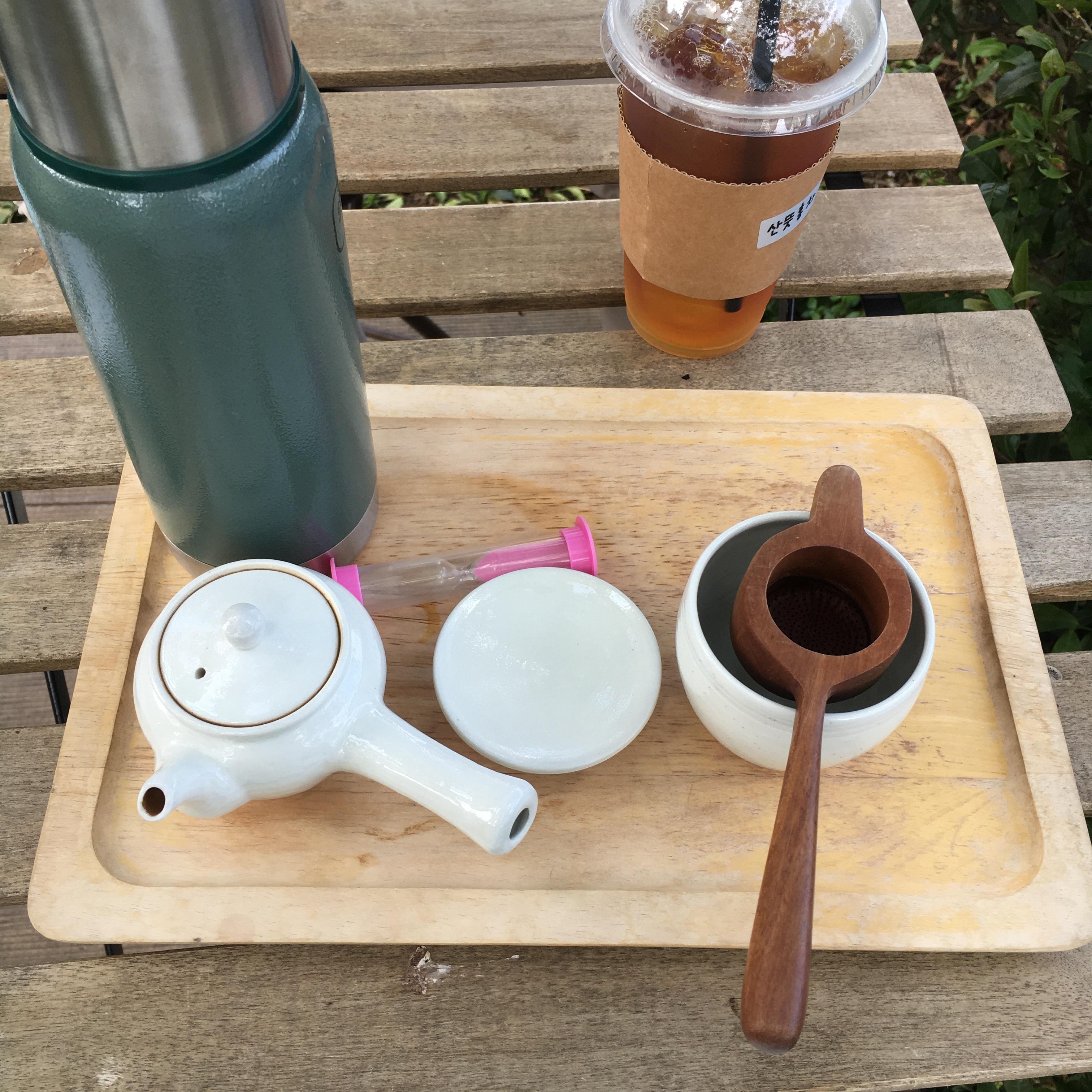 산뜻 홍차 아이스와 우전녹차를 주문했습니다. 보온병 물을 넣어 1분 정도 우려내서 마시면 된다고 해요. 모래시계를 함께 주시는데 이 모래시계가 1분짜리라고 합니다. 세 번까지 우려 드실 수 있다고 해요.