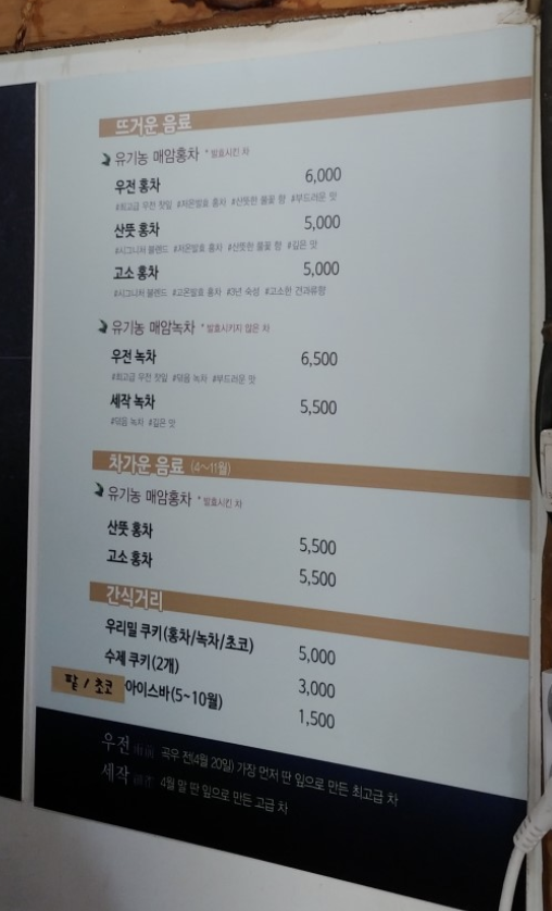 매암 다방에서 판매하는 차는 직접 재배하고 만드는 유기농 차고, 찻값은 관람료를 대신하여 박물관 운영비로 사용된다고 합니다. 녹차는 뜨거운 상태로만 드실 수 있고, 홍차는 우전 홍차를 제외한 산뜻 홍차, 고소 홍차를 시원하게 즐기실 수 있습니다.