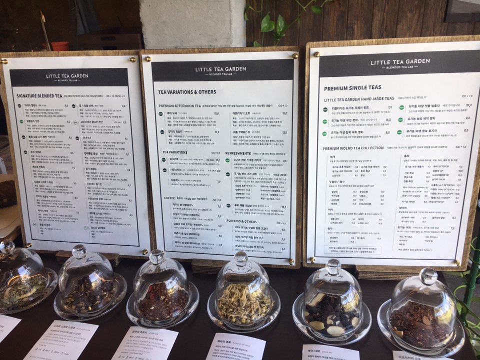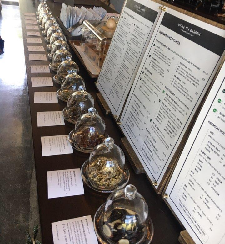 메뉴는 티 종류와 커피, 어린이 음료, 디저트가 준비되어있습니다. 저처럼 티가 생소하신 분들을 위해 메뉴판 앞에 시향 가능하게 진열해두셨더라고요. 하나하나 시향 해보시고 티를 선택하실 수 있습니다. 시향 해보니 티 종류별로 각각 개성이 있더라고요.