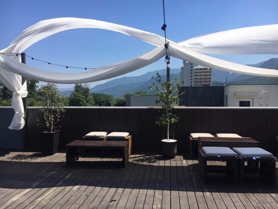 처음엔 1층이 끝인 줄 알았는데 옥상 테라스도 있었습니다. 옥상테라스도 너무 멋있지 않나요? 날이 덥지만 않으면 옥상 테라스에서 마셨을 거예요. 잠깐 더위 식힌다고 앉아있다 포토존인 야외석으로 나갔습니다.