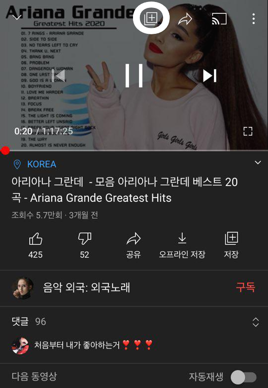 유튜브 재생중인 화면을 터치하시면 위와같이 전 영상/일시정지/다음 영상 아이콘위쪽에 정 사각형안에 들어있는 + 아이콘을 클릭하여주세요.