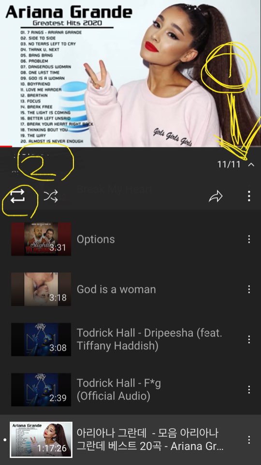 클릭하셔서 들어가시면 위와같이 내가 넣었던 노래목록이 보이게되는데요. 제가 11곡을 넣어둬서 11/11로 뜨는데 들어있는 곡 수의 오른쪽에 ^ 와같은 화살표 아이콘을 클릭하시면 2번과같이 반복재생 아이콘과 랜덤 아이콘이 보이게됩니다.