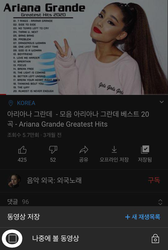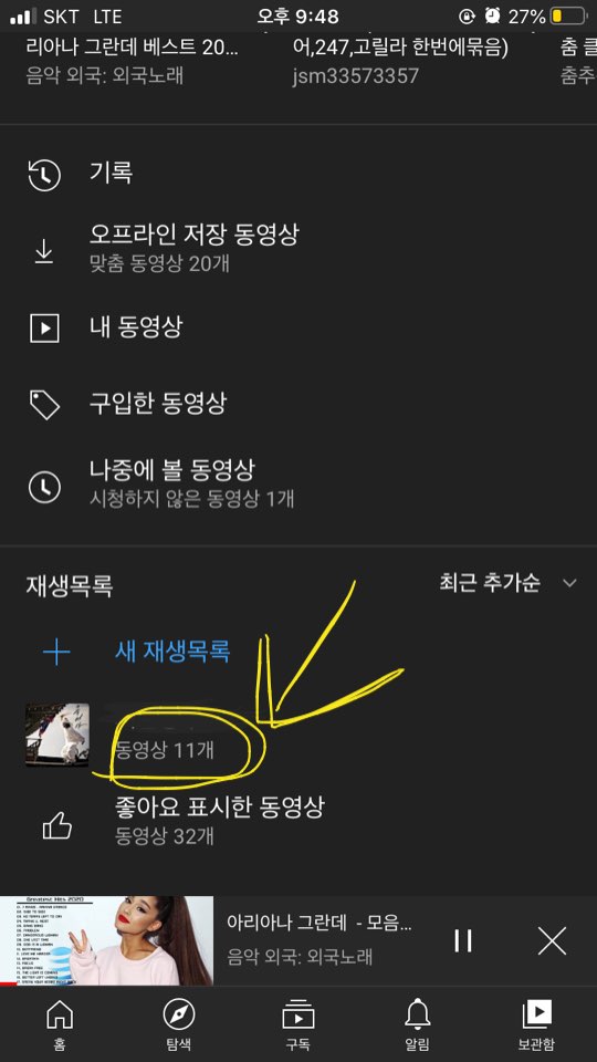동영상저장 폴더가 뜨게되는데요, 나중에 볼 동영상으로 선택해주시면 됩니다. 따로 넣어서 보고싶으시거나, 듣고싶으신게 더 있으시다면 + 새 재생목록을 클릭하셔서 연속재생하고싶은 영상을 모아두셔도 됩니다.