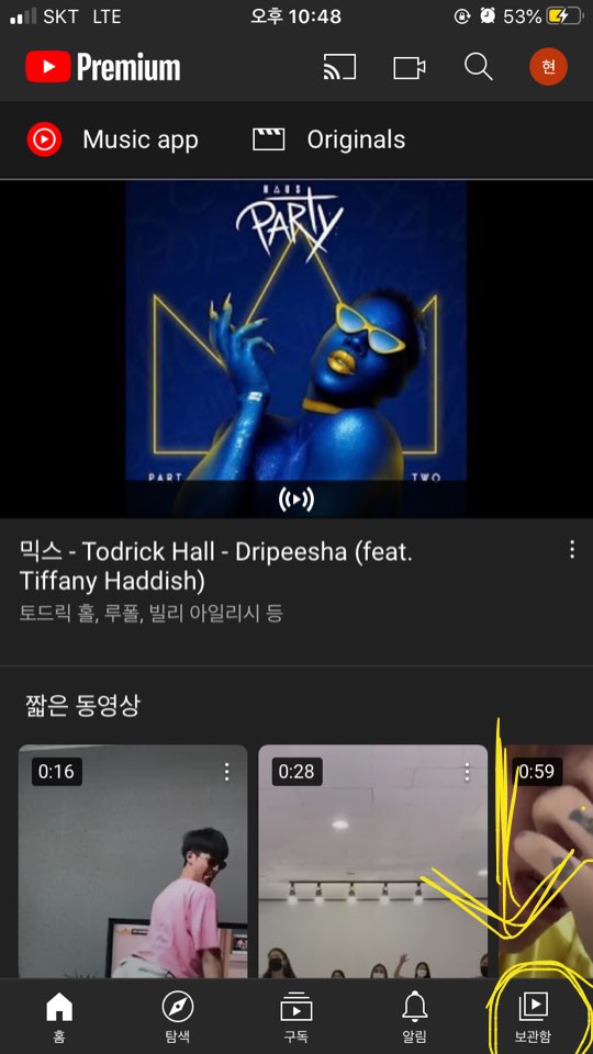 나중에 볼 동영상으로 넣으신 다음 유튜브 화면 아래의 홈/탐색/구독/알림/보관함 바에서 제일 오른쪽에있는 [보관함]을 클릭해주세요.