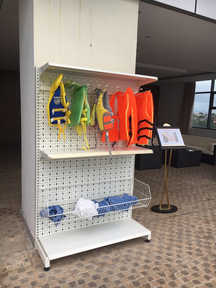 한쪽에는 아이들과 함께 오신 분들을 위해 아이들 구명조끼와, 어른용 구명조끼가 있었습니다. 다 쓴 타월은 아래 놔두시면 되고 수건이 필요하시면 바로 뒤쪽에 카운터에 가셔서 달라고 하시면 됩니다. 이 수건을 방까지 들고 가지는 못한다고 해요.
