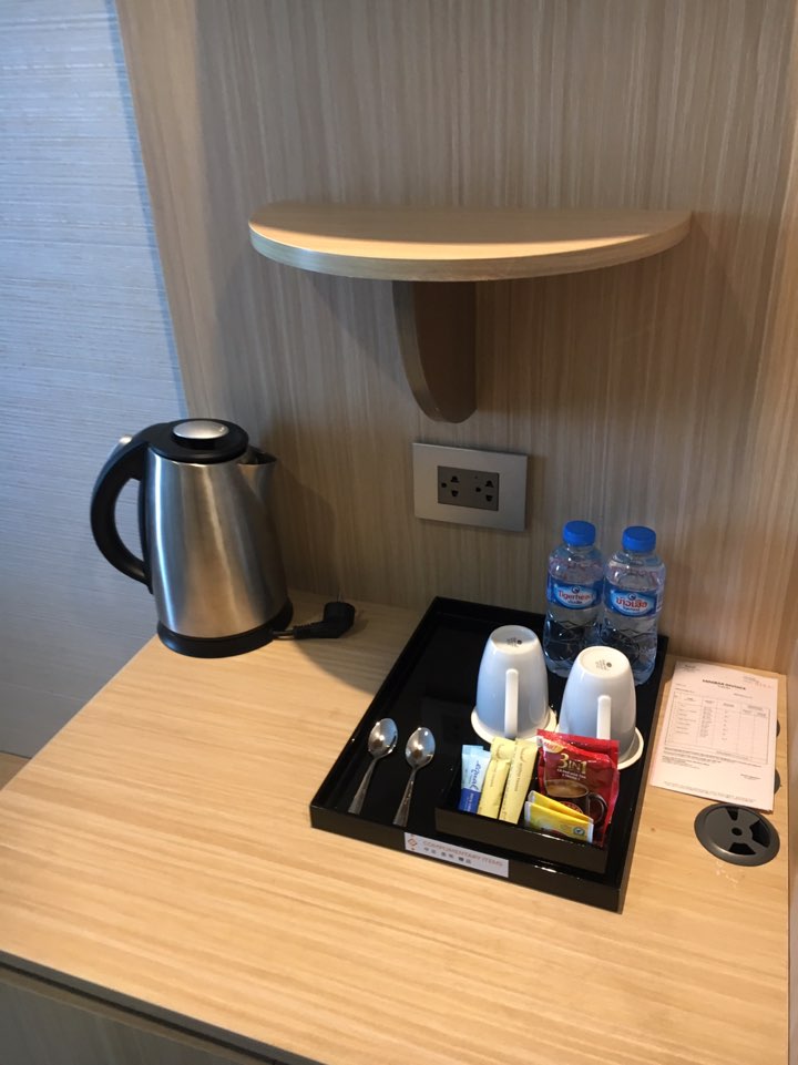 방배정을 받고 방으로 들어갔을 땐 그냥 다른 호텔과 다를 게 없구나 했었는데 여기저기 둘러보는 순간 그런 생각이 싹 사라지더라고요. 커피포트와 생수, 티와 커피가 준비되어있습니다.